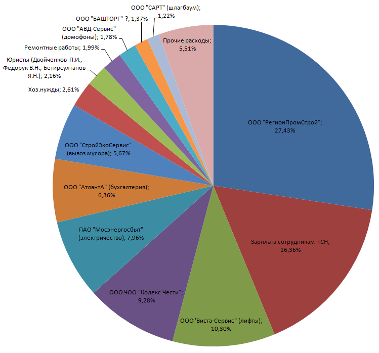 1. Ожидаемый лидер по расходам - ООО "РегионПромСтрой", на его долю пришлось 27,43% расходов ТСН. Об аффилированности данной компании с НБМ уже много написано ранее, поищите на форуме самостоятельно (те самые ребята, которые восстанавливали нам освещение за 1млн., обслуживают сети НБМ и предоставляют нам дворников всего за 170 000 рублей в месяц).