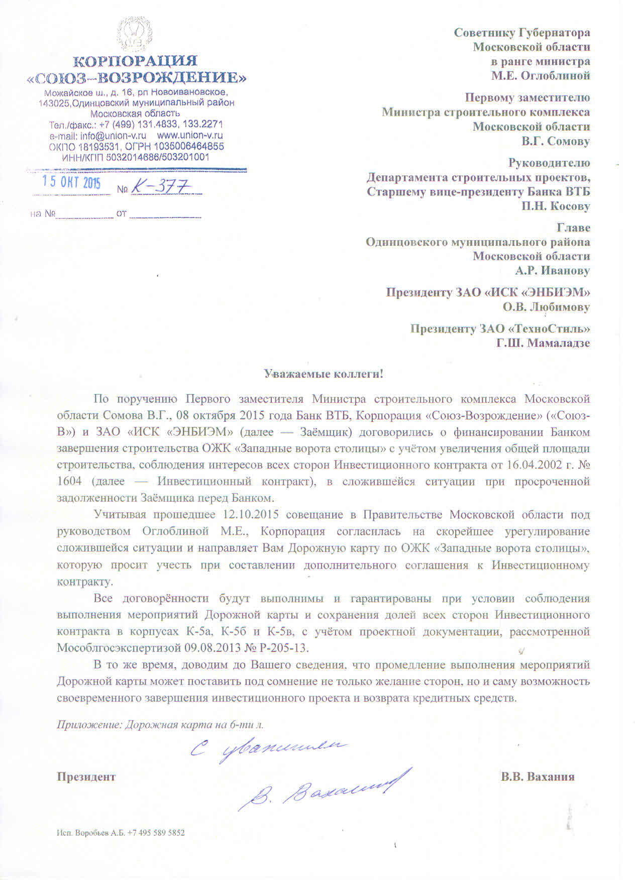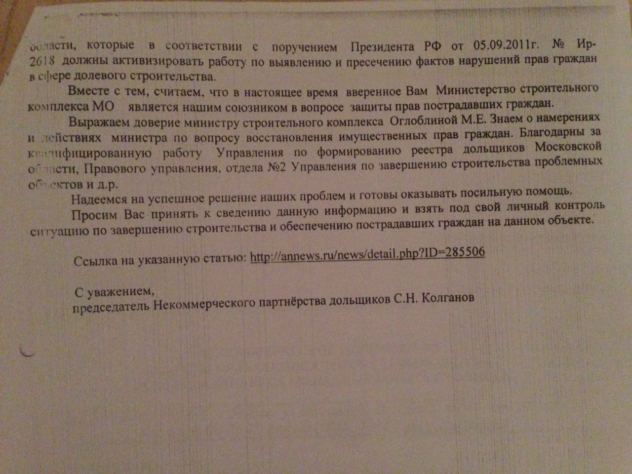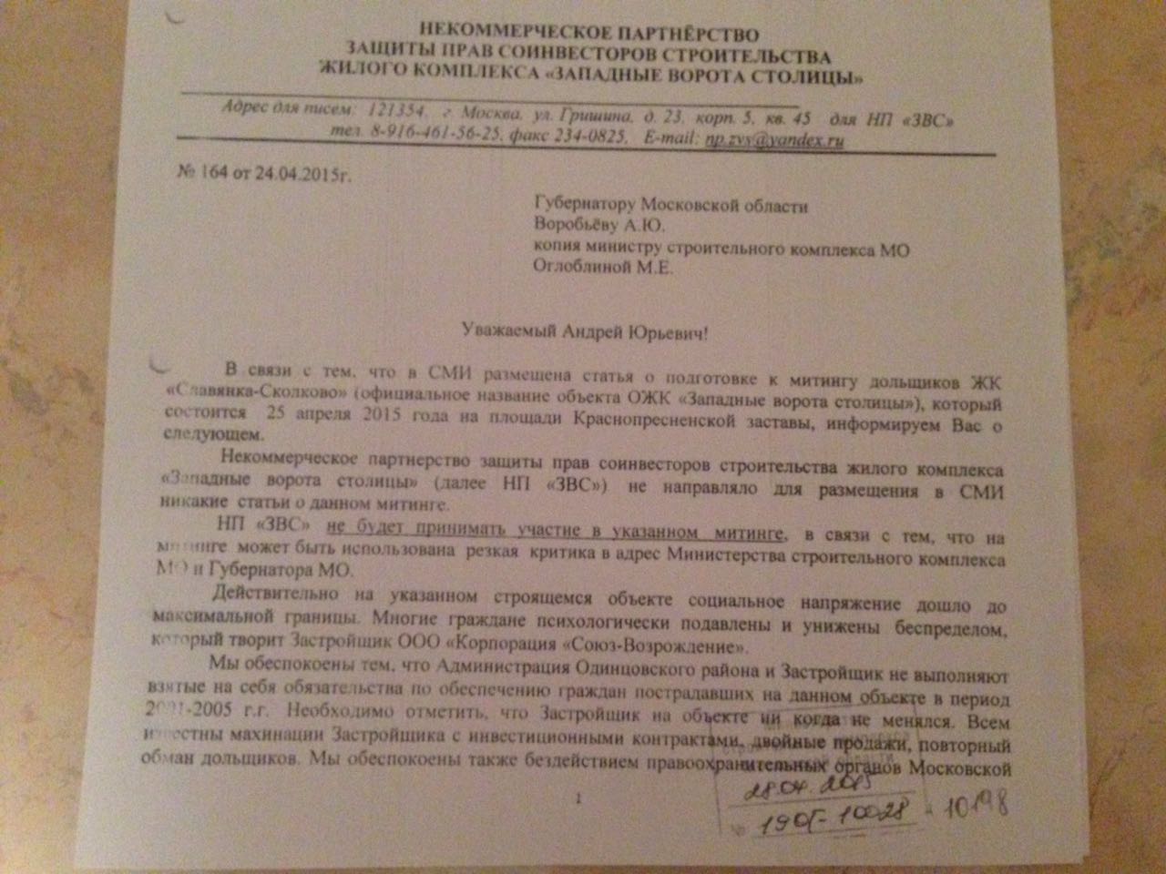 К великому сожалению, мы все - ПОЛОЖИЛИСЬ на ВЛАСТЬ и губернатора с ВЕСНЫ 2015 года.Andrey писал(а):Как я понял из этого письма Некоммерческое партнерство не принимало участие в митинге 25 апреля 2015 года, полностью положившись на чиновников Миноблстроя и Губернатора МО, которые уже и забыли о существовании ЖК ЗВС. Судя по результатам разработанной ими «дорожной карты». Следуя логике этого письма НП не будет принимать участие и в запланированных акциях, изложенные в программе «12 шагов». Получается, что НП (г-н Колганов) всё-таки на определённые компромисы пошли. Тем более что на последнем собрании дольщиков в администрации ОР его не было. Не хочу развивать мысль дальше, надеюсь, что я не прав…