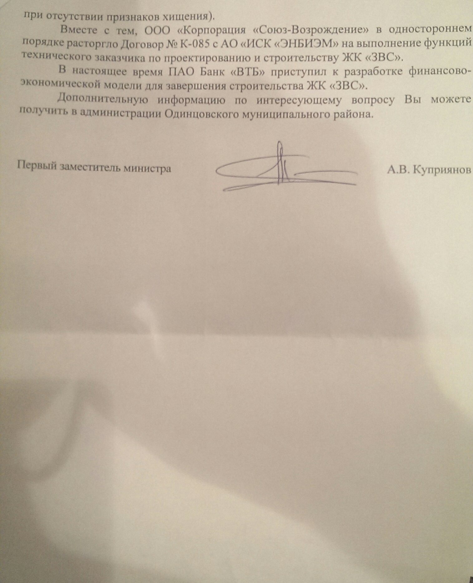 Много лет назад, я законопослушный гражданин России, вложил свои средства для оплаты квартиры в ЖК «ЗВС». Все эти годы я и моя семья жили ожиданием получения ключей от нашей квартиры. Но наши надежды разбились о циничность и алчность застройщика ООО «Корпорация «Союз-Возрождение», об организационную импотенцию и жульничество соинвестора и генподрядчика «ЭНБИЭМ», о беспомощность подмосковных властей, не способных на протяжении 15 лет навести порядок на таком социально-значимом участке, как долевое строительство!