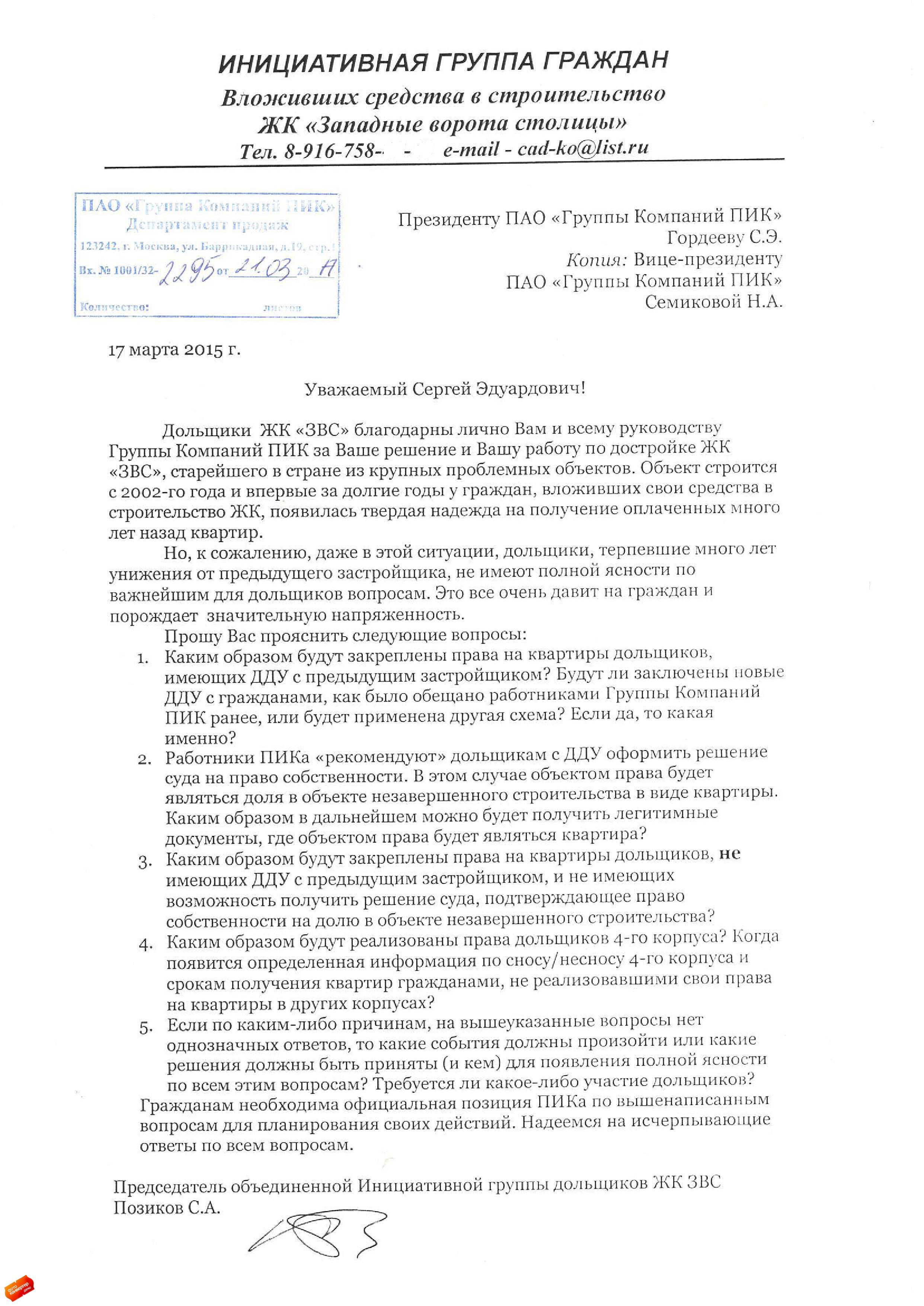 По поводу подтверждения прав дольщиков с ДДУ на квартиры. Давно об этом идут разговоры, но старались сюда, на общее обозрение не выносить этот вопрос, т.к. ПИК свою позицию однозначно не заявлял. В пятницу нам эту позицию устно, но "официально" заявили - ПИК заключать новых ДДУ с дольщиками не намерен. В качестве легализации прав на квартиру "рекомендуется" получать решение суда. Мы просили письменное подтверждение этого, нам предложили написать официальный запрос и ждать ответ. Запрос на имя Гордеева и Семиковой вчера отправил по по эл. почте, сегодня отвез и сдал в ПИК.