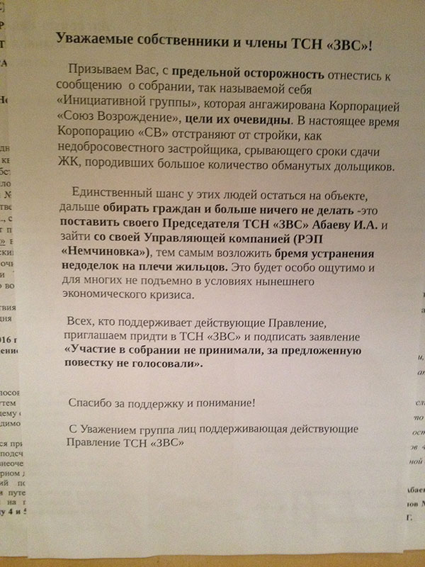 Сергей) боятся собрания, противодействуют собранию как могут. Но расклеивание таких объявлений явно указывает на то, что это не "группа лиц, поддерживающая текущее ТСН" а само ТСН.