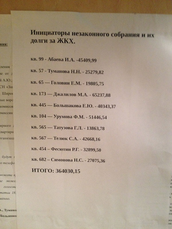 Тсн только добавило сумму долга??? Виталий Николаевич, вопрос снят. Вы сами на него и ответили. Объявления, содержащие подобную информацию, размещали все-таки оставшиеся члены ТСН. И позвольте с вами не согласиться, де юре закон о персональных данных нарушен.