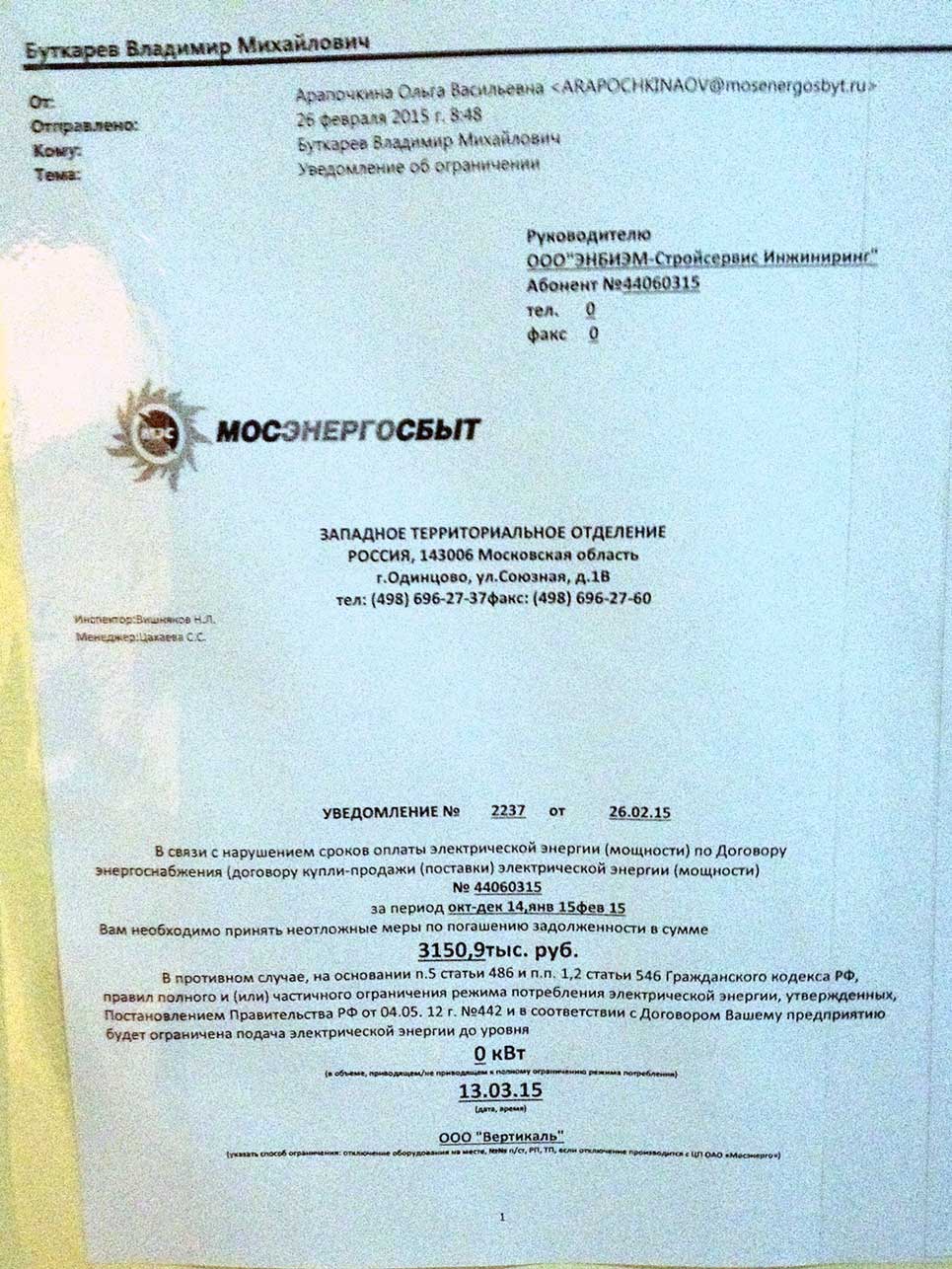moser писал(а):Виталий Николаевич, иск подан на ЭНБИЭМ-СтройИнтер, а у нас висит уведомление от МОЭСК для ЭНБИЭМ-Стройсервис Инжиниринг.Dimovvv писал(а):должны принять в эксплуатацию то что имеем на сегодня УСЛОВНО