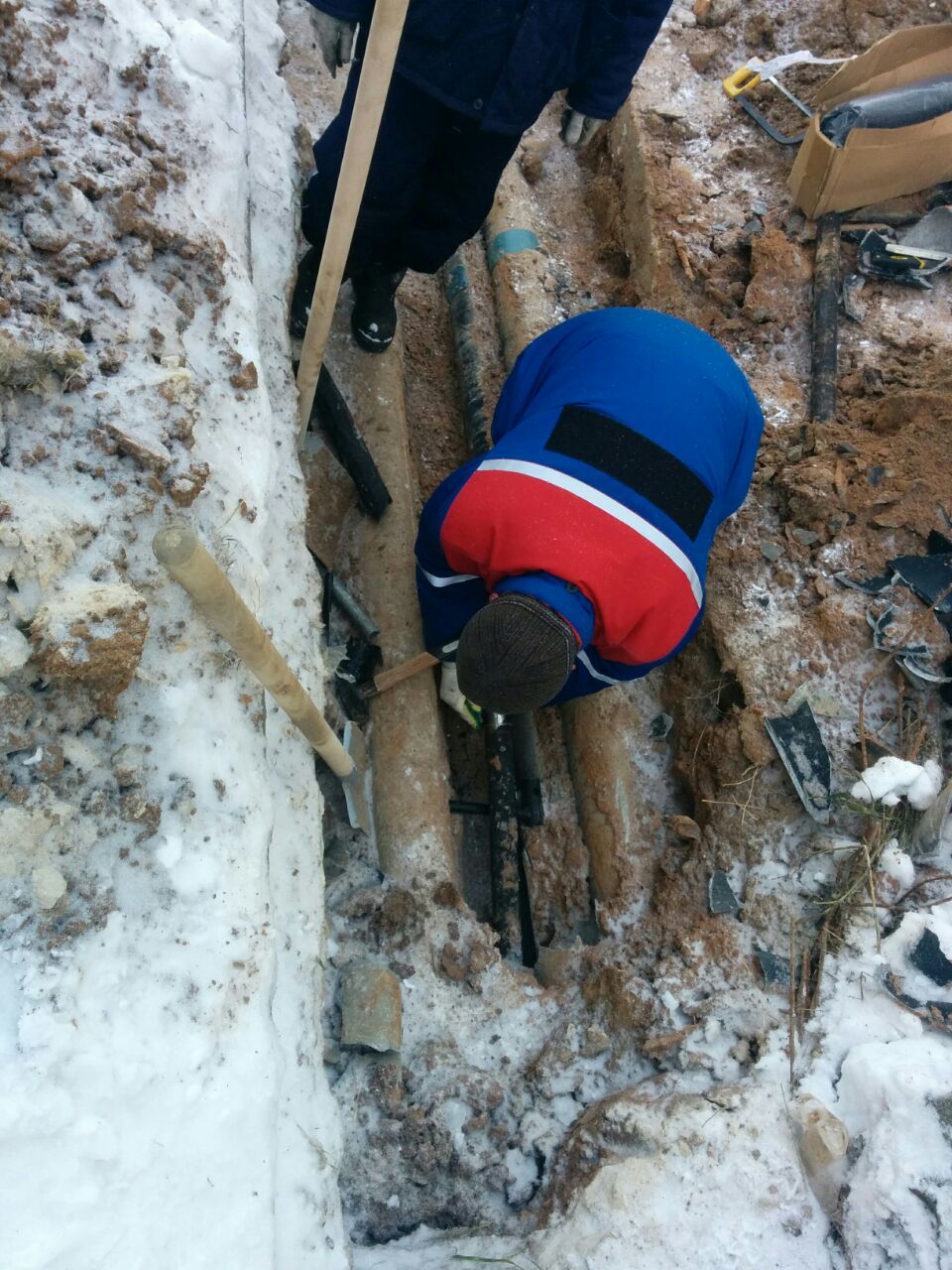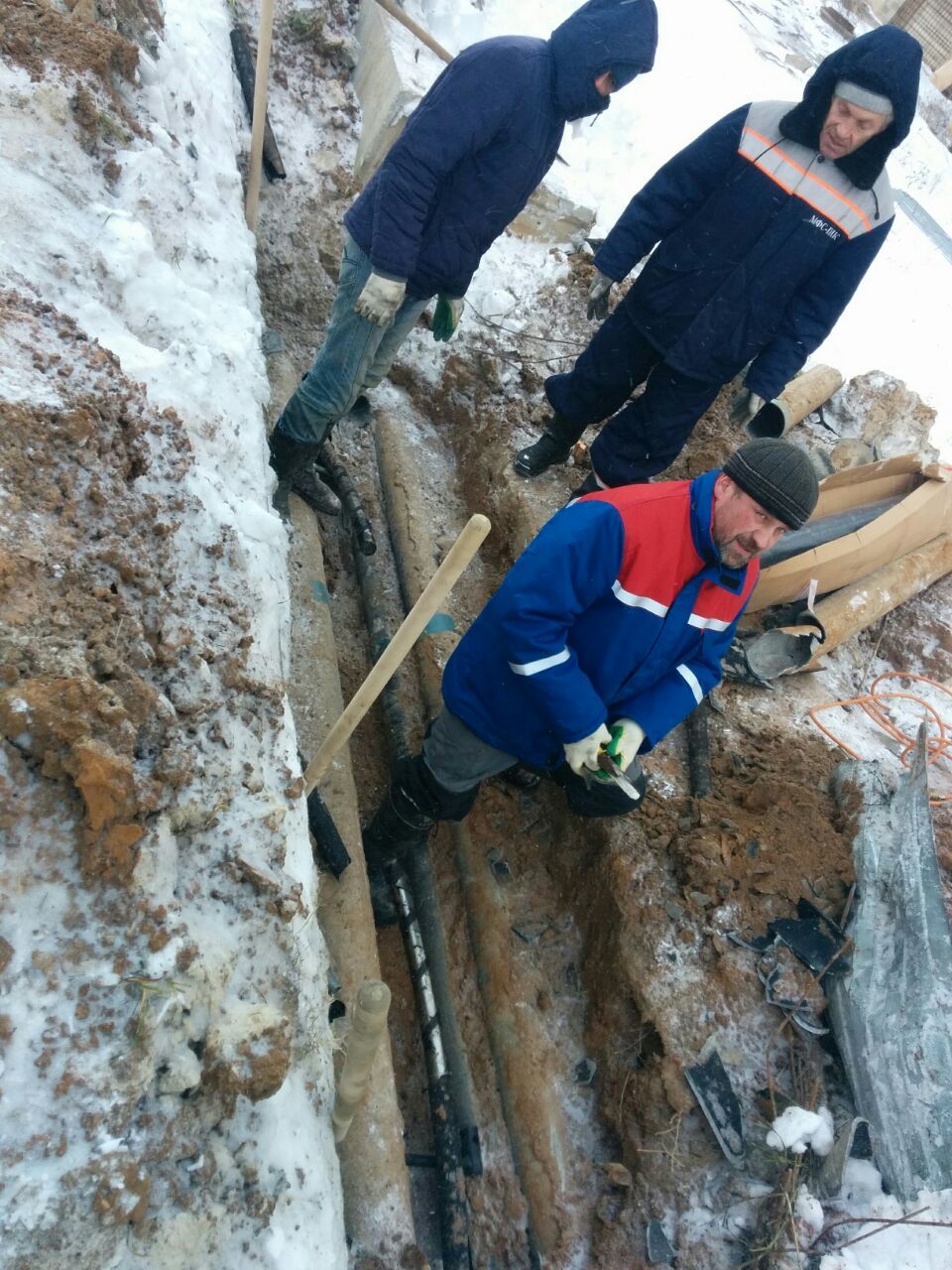 Рано утром было обнаружено место обрыва кабеля. Оно находится между 1 и 2 корпусом, рядом с торцевой частью 10 секции.