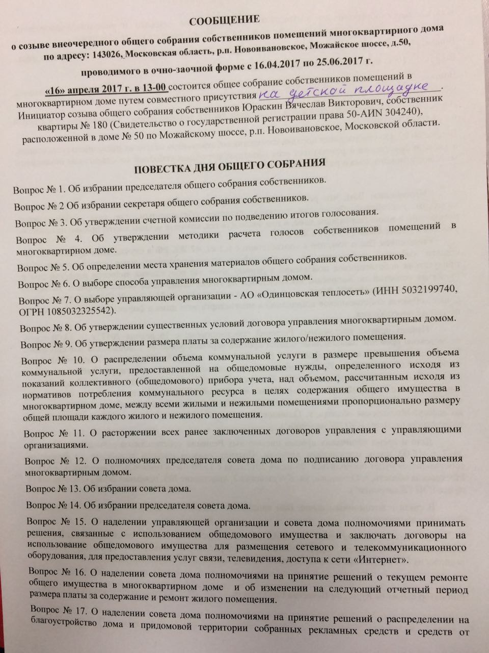 Прошло 5 лет от сдачи дома… Кончился гарантийный срок… Сменилось 3 председателя правления ТСЖ… Только на адвокатов (и это только на дела по законности правления) за последние 2 года думаю потрачено более 2 млн руб жителей нашего дома… К сожалению, выхода из создавшейся ситуации не предвидится (никто из противоборствующих группировок не уступит, даже ради самих жильцов) … Я всегда говорил, что мне ближе всего схема управления в доме в виде ТСЖ, но к сожалению я вижу, что в нашей ситуации единственный выход пригласить управляющую компанию, которая наведет порядок в платежной дисциплине и наконец постепенно исправит если не все недоделки, то хотя бы часть. Конечно я предвижу сейчас слова: «Конечно за наш счёт!», но пора снять розовые очки. В текущей ситуации мы должны понимать, что ни НБМ (банкрот), ни СВ (погрязнем в судах и толку не будет), ни Одинцовская Администрация (официально давно открещиваются от нас) не будут исправлять недоделки и ставить лифты. Наша задача минимизировать финансовое бремя на жителей! Было принято решение предложить жителям нашего дома найти выход из данной ситуации через выборы формой правления дома УК. Инициатором данного собрания буду я, Юраскин Вячеслав. В течении недели к вам придет сообщение об организации собрания по выбору формы управления в виде УК. Форма этого сообщения будет выложена здесь на сайте и также вывешена в подъездах. Я призываю жителей ещё раз взвесить все ЗА и Против прихода УК. Сейчас подготавливается подробный список ответов на самые острые вопросы, чуть позже он будет опубликован. При проведении очного голосования Вы сможете задать все неохваченные в нем вопросы представителям УК. Со своей стороны, я приложу все усилия, что бы данное голосование прошло абсолютно в рамках закона, не было фальсификаций и подделок листов голосования! В счетную комиссию мы пригласили представители и от ЖСК и от ТСЖ (пока ответы об участии получены не все). Победа в данном голосовании любой ценой не нужна, мы просто видим в этом шанс для всех нас выйти из этой тупиковой ситуации и мы примем любое решение жителей нашего ЖК. Также на этом собрании будет предложено выбрать совет дома. В него мы постарались включить представителей из всех 10 подъездов. Совет дома будет работать в интересах всех жителей! Основная функция – контроль за управляющей компанией.