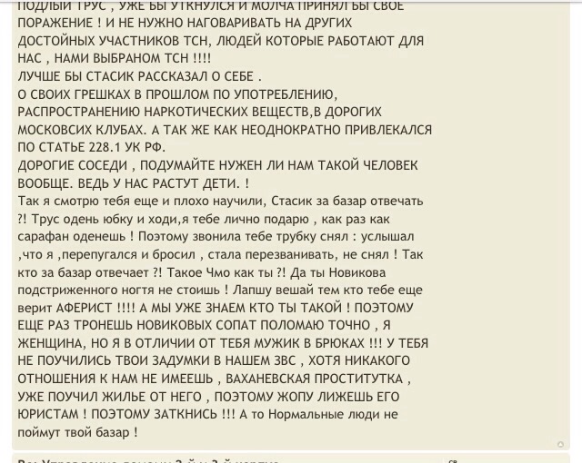 Раз удалил эти сообщения из-за прямых оскорблений, сейчас думаю пусть висят - очень хорошо всю эту компанию характеризует. Без комментариев все понятно, что за люди. Много про меня они врали, но фантазия больная не знает предела. Теперь и наркотики сюда приплели))) И судимость за наркотики :!: . Один раз меня в жизни судили - за организацию палаточного городка на ЖК ЗВС.