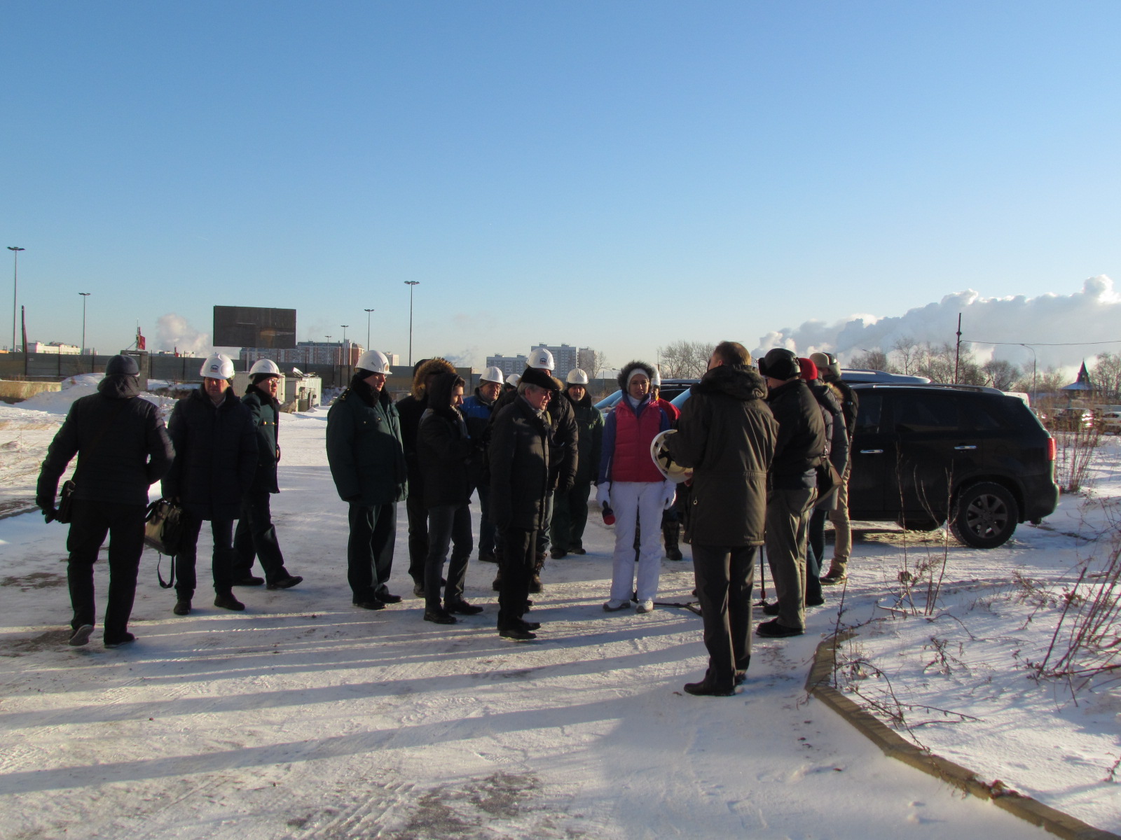 Делегация Госстроя в окружении журналистов и представителей застройщика.