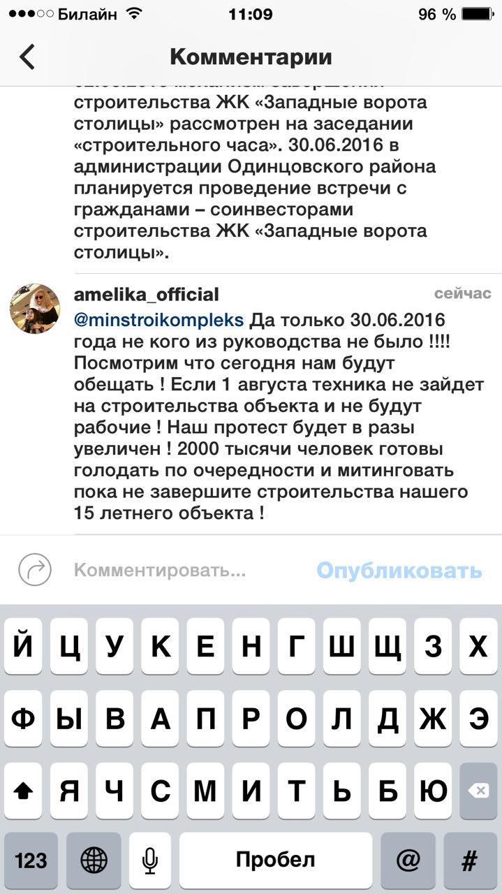 Уверяем вас, что в случае неисполнения плана действий по завершению строительства ЖК «Западные ворота столицы» мы осуществим наши законные акции, которые прогремят на всю Россию.