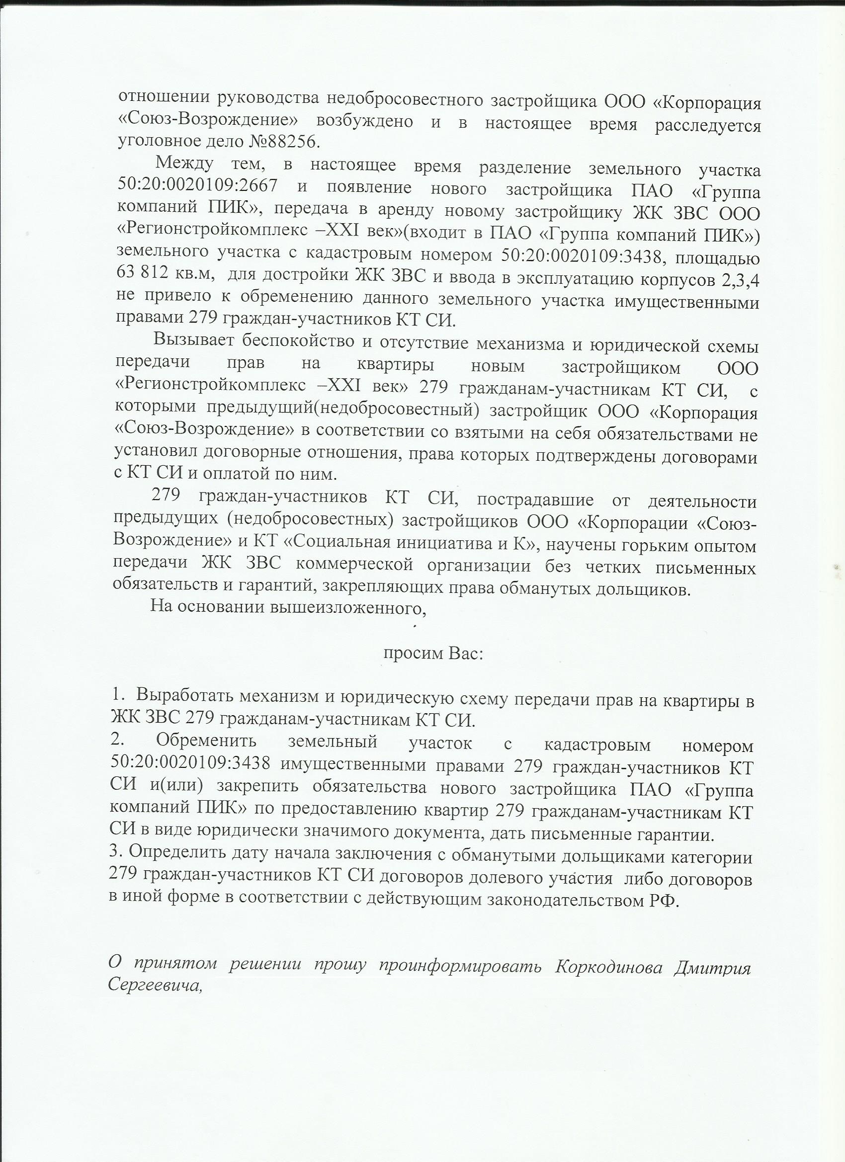 Дежавю. ПИК=СВ. Теперь ПИК начинает выкручивать нам руки, хотя компенсацию за решение проблем с дольщиками ЗВС в виде земельного участка в Красногорске они уже получили. Нам вновь предлагается доказать, что дольщики ЗВС не верблюды и по формальным причинам пытаются отказать нам в наших правах на свои квартиры. Одна из них, это требование справки о признании потерпевшим по уголовному делу. Очередная пустая бумажка. Большинство дольщиков зарегистрированы в Реестре Министерства строительства Московской области и признаны комиссией обманутыми дольщиками ЗВС. Некоторые дольщики пытались выйти на следователя по данному уголовному делу, но все попытки контакта следователем полностью игнорируются. Попытки выхода на руководителя 4 отдела ГСУ, в ведении которого находится это дело, также оказались тщетными. Мы были на приёме у первого заместителя ГСУ МВД по МО г-на Филиппова Д.В. по поводу вызова на допрос в рамках уголовного дела, нам было заявлено, что ГСУ не будет заниматься проверкой дольщиков ЗВС, о чём в адрес группы компании ПИК направлено соответствующее письмо. На этом приёме было заявлено, что ПИК должен проверять дольщиков по другим источникам информации, в частности через Министерство строительства Московской области. ГСУ не собирается вновь открывать это дело и вызывать дольщиков на допрос. Требуя эту справку ПИК опять загоняет нас в тупик. Поэтому у ПИК и любезности закончились...