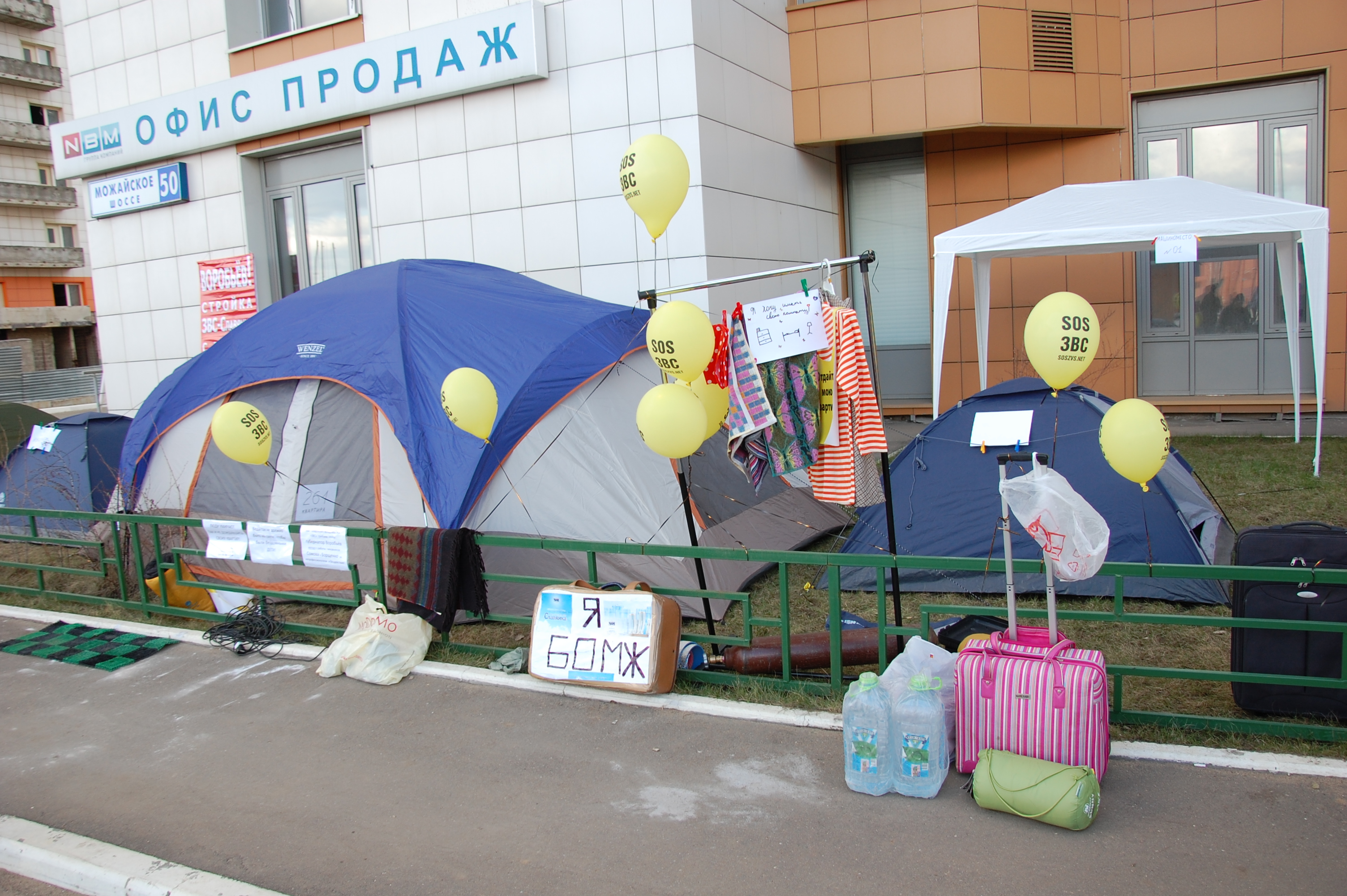 "Дольщики, ждущие свои квартиры 13 лет в отчаянии разбили палаточный городок у недостроенного ЖК "Западные ворота столицы" (Славянка-Сколково) и будут жить в нем до приезда губернатора. Работники министерства строительного комплекса не нужны, они уже все сказали. В палаточный городок приглашены также все СМИ и уполномоченный по правам человека при Президенте РФ. http://soszvs.net/"